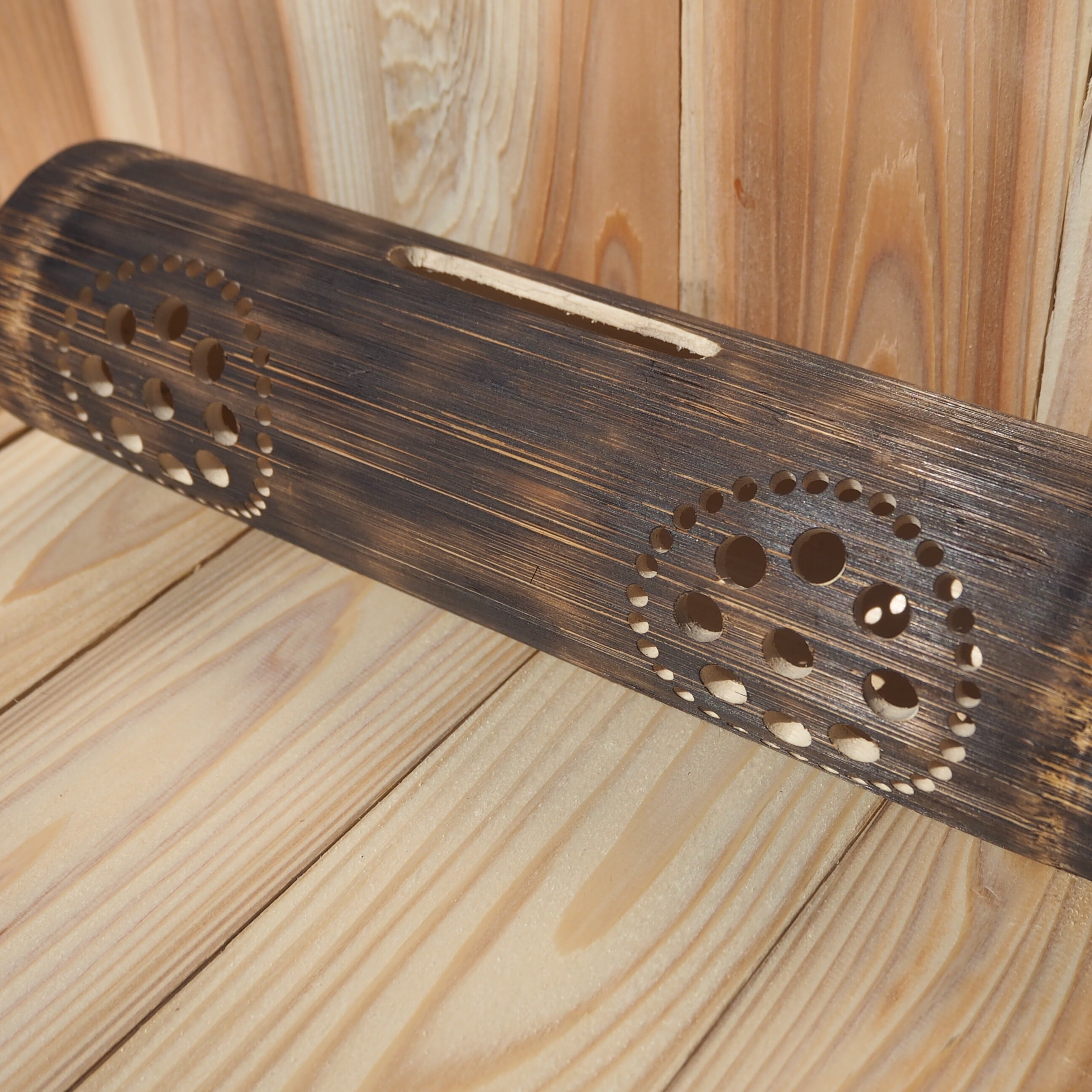 れんこんのデザインを描くところから始め、竹を伐採し、皮をむき、焼き目をつけ、ひとつひとつ穴をあけて作る、唯一無二の作品です。