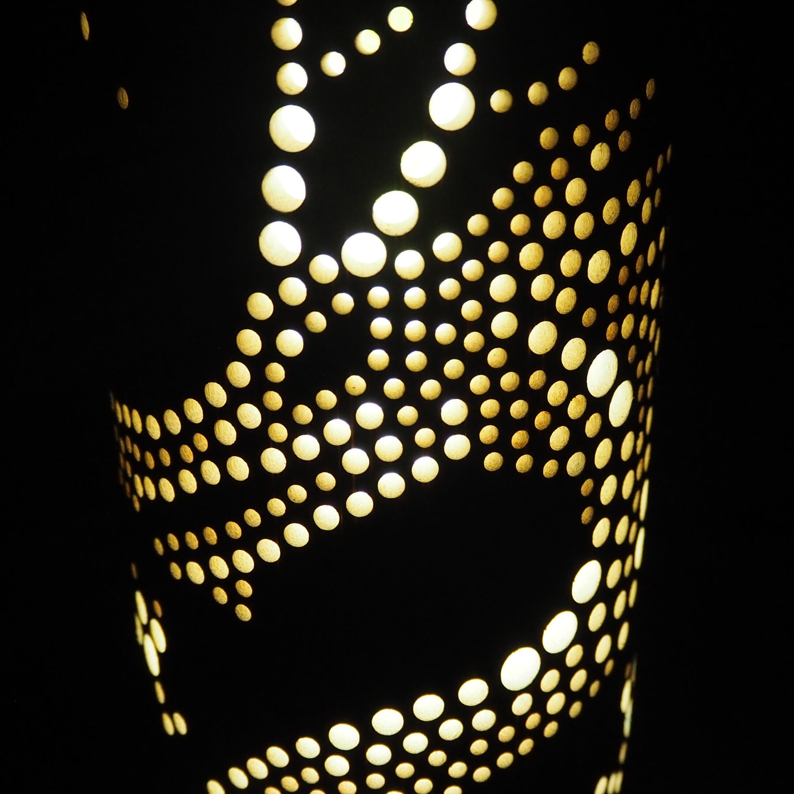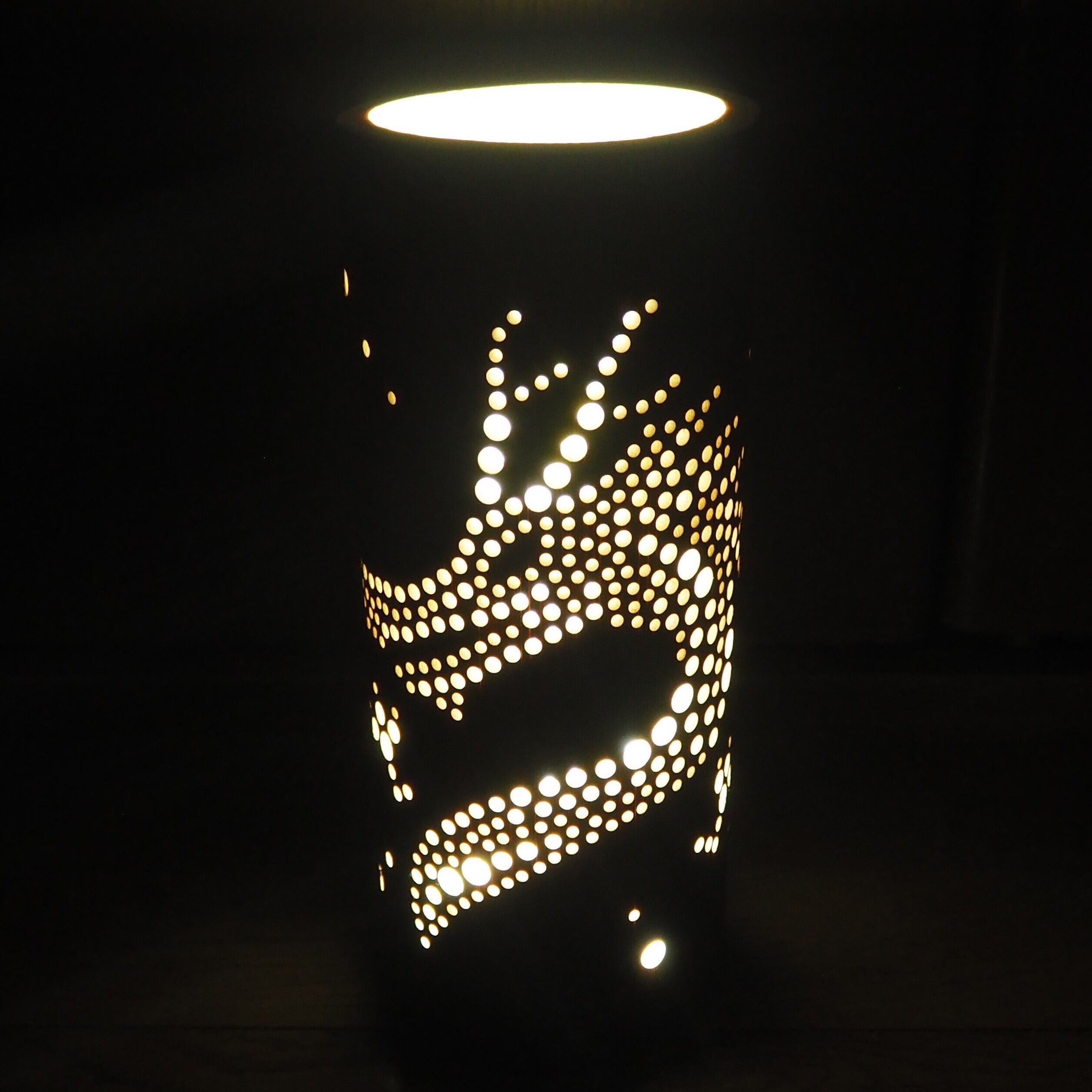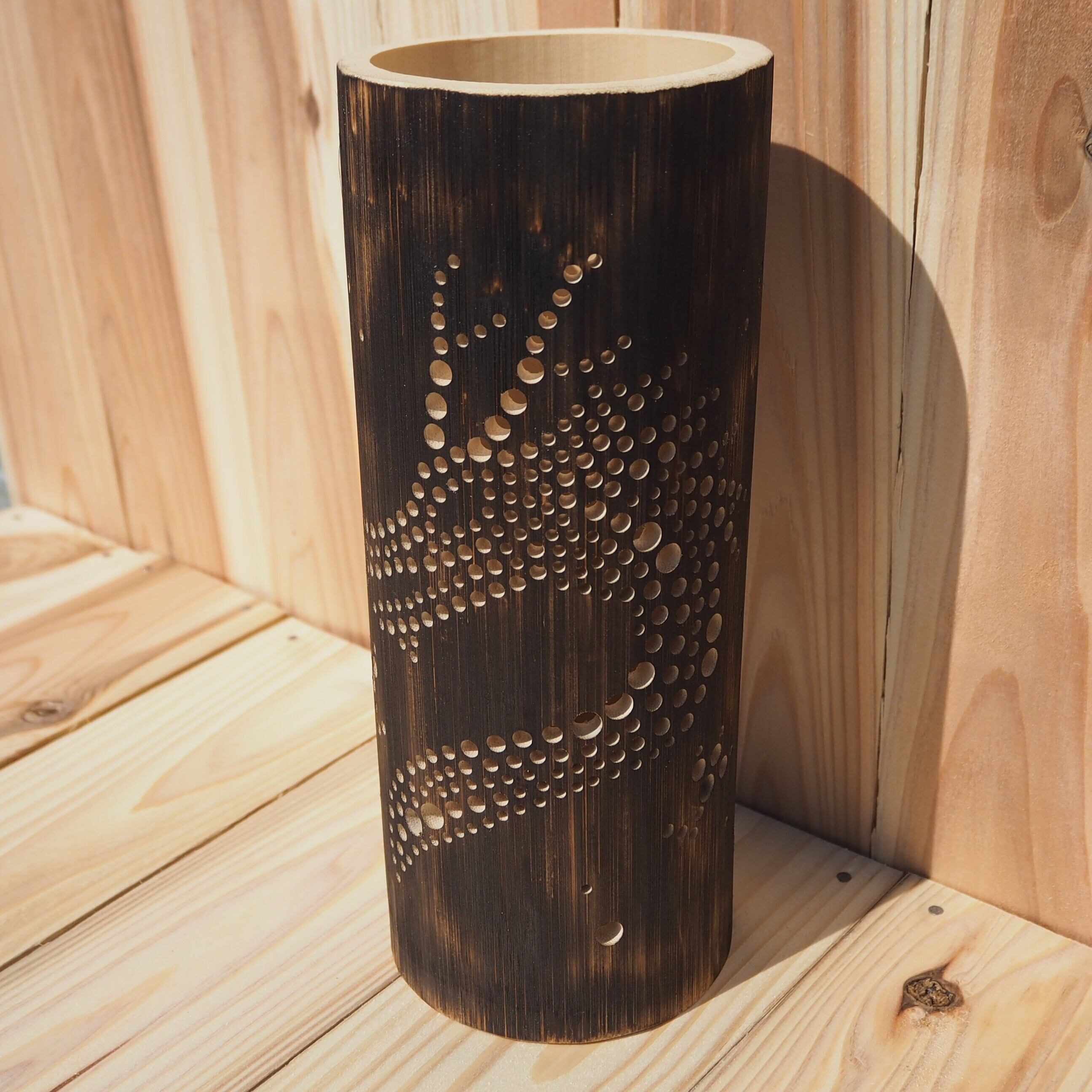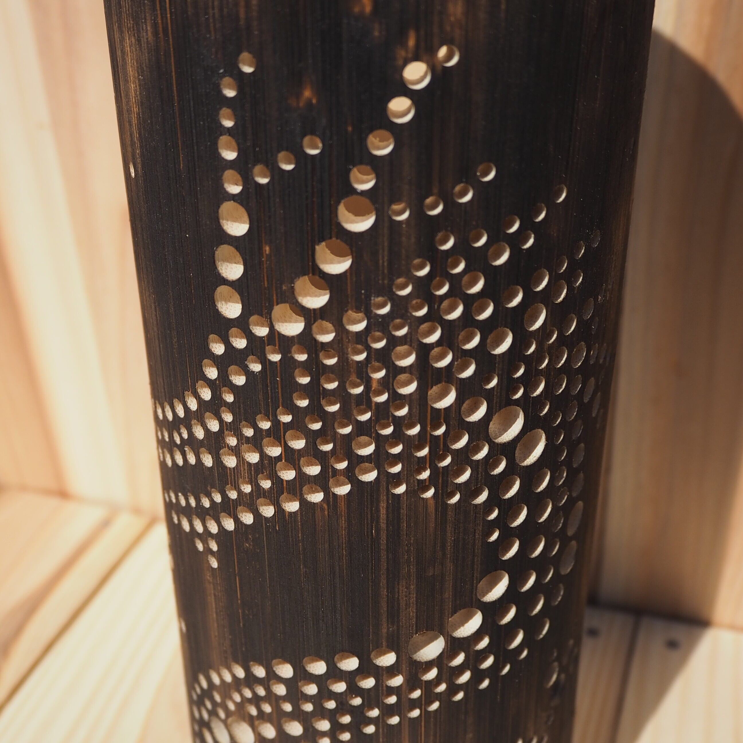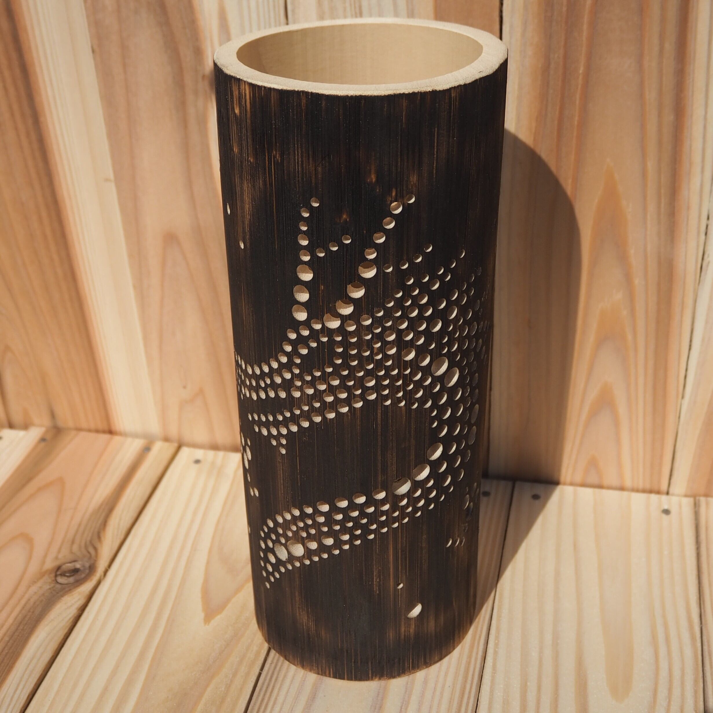 龍のデザインを描くところから始め、竹を伐採し、皮をむき、表面をバナーで炙り、ひとつひとつ穴をあけて作る、唯一無二の竹灯籠です。