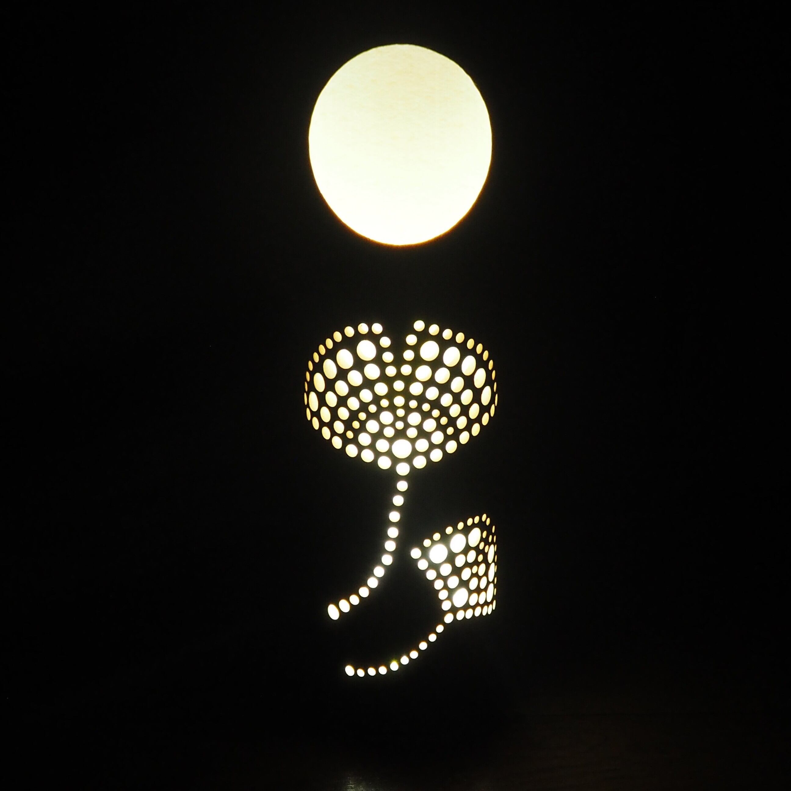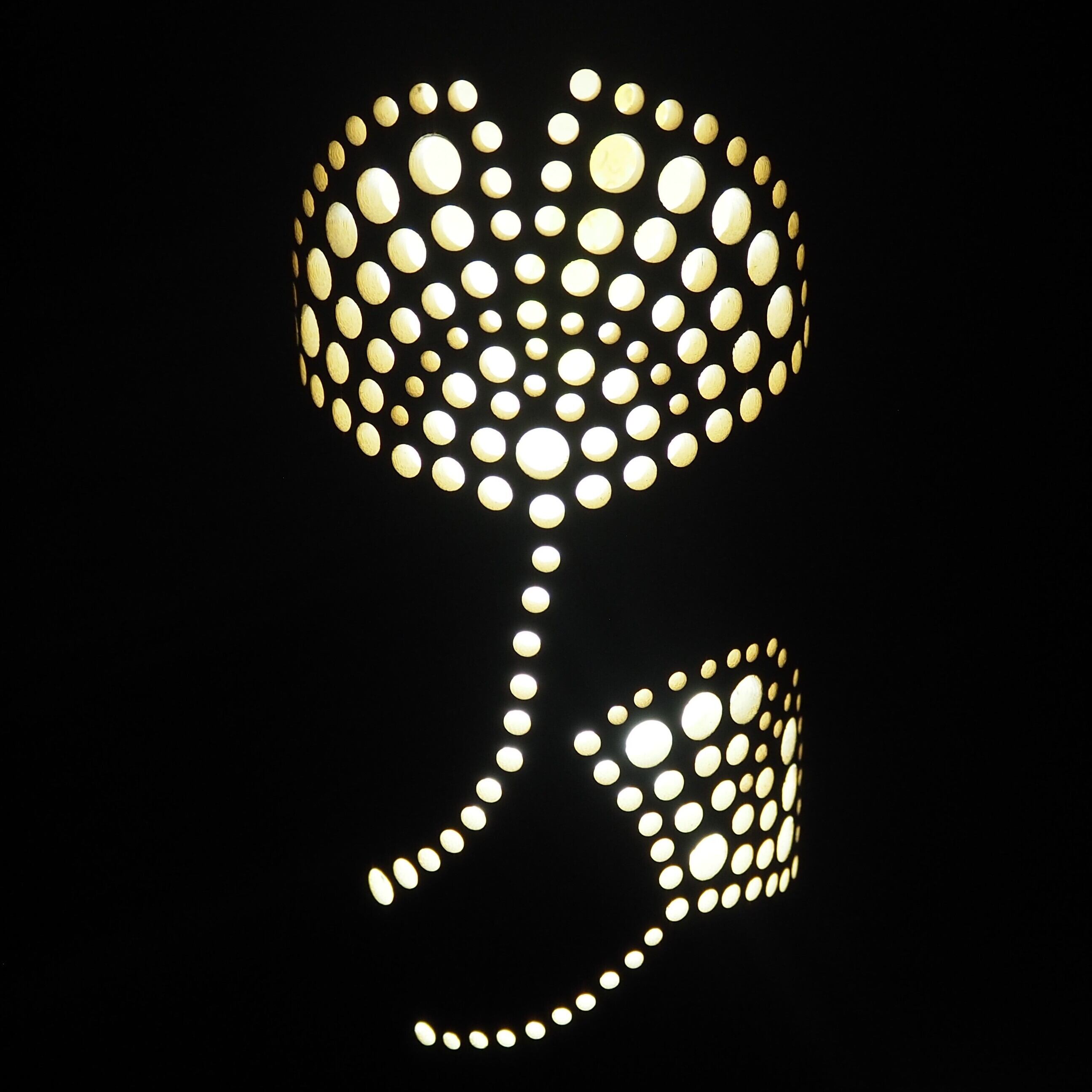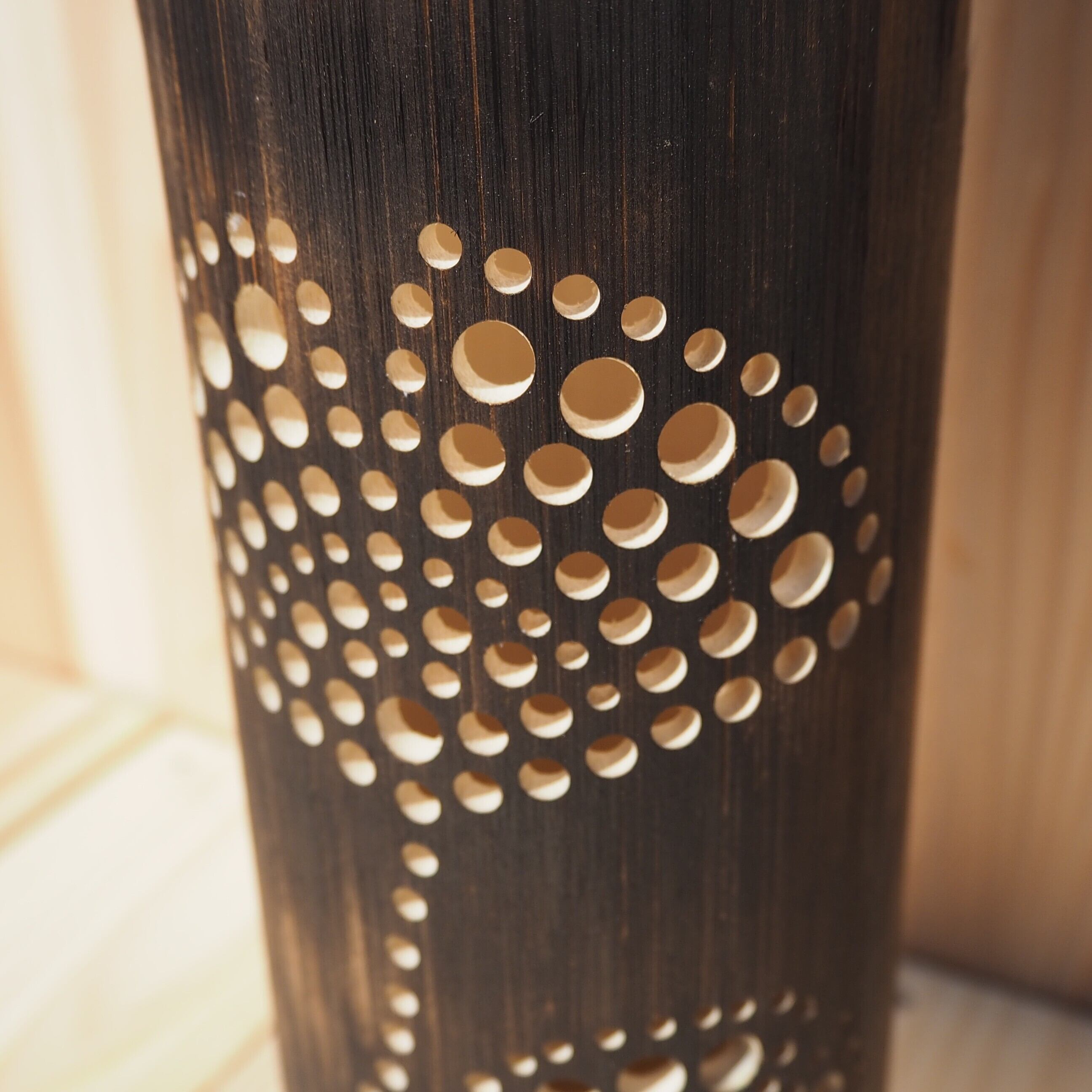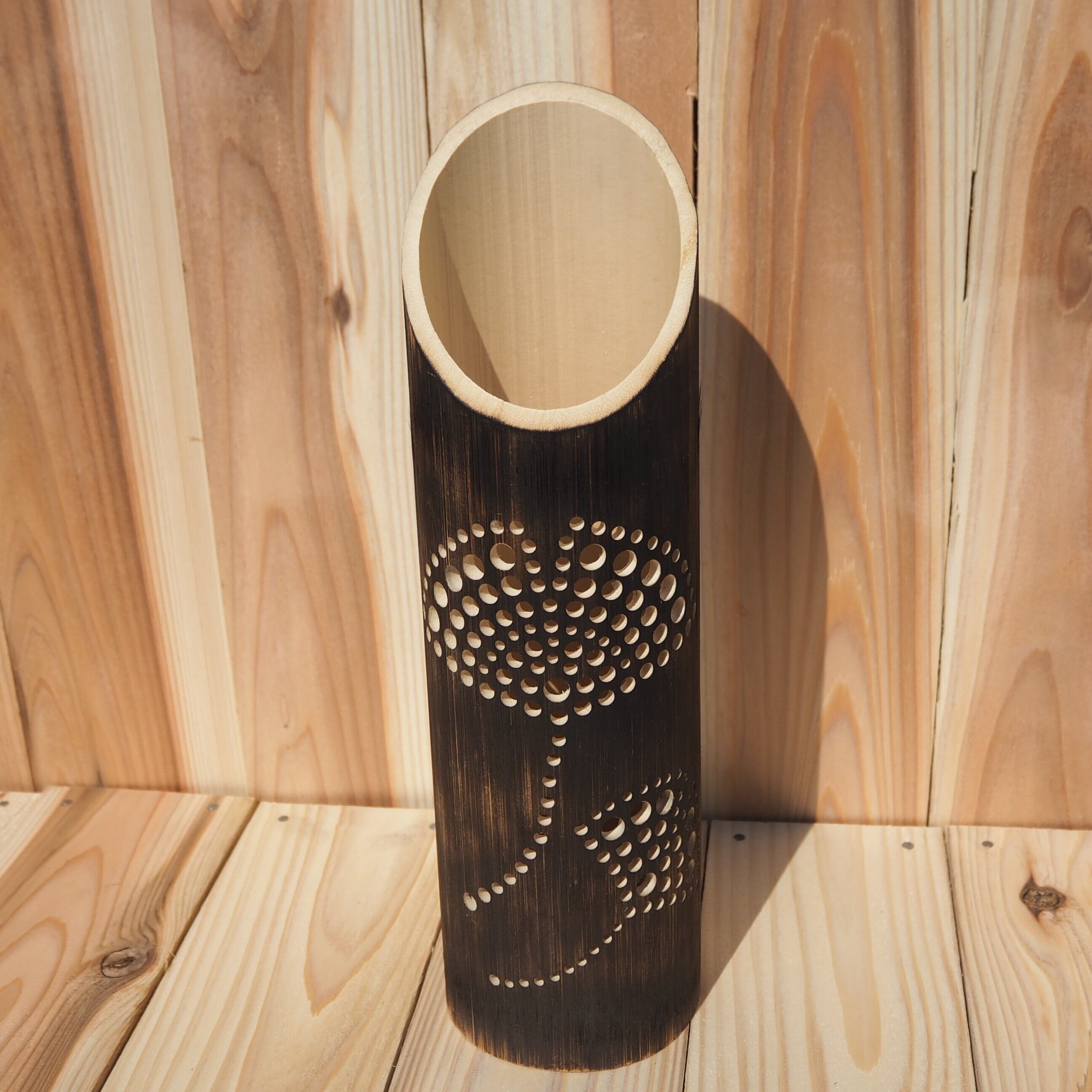 花のデザインを描くところから始め、竹を伐採し、皮をむき、表面をバナーで炙り、ひとつひとつ穴をあけて作る、唯一無二の竹灯籠です。